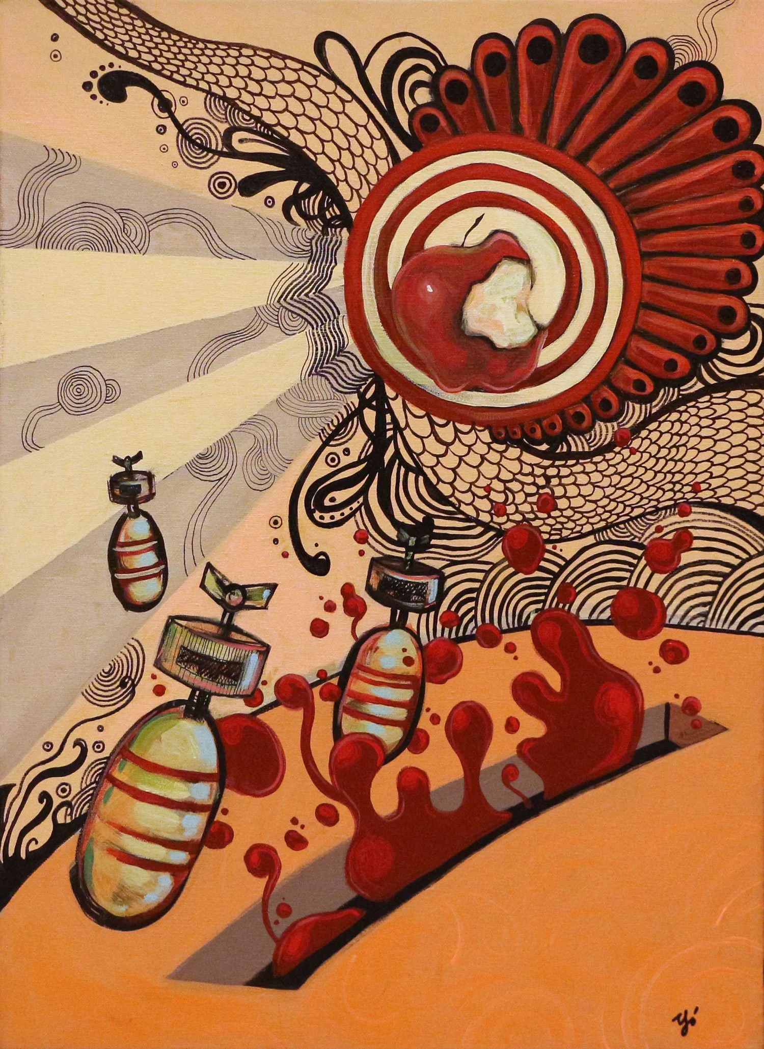 Forbidden Fruit is a mixed media series that explores the tension between knowledge, temptation, and consequence. Each painting centers on a symbolic fruit—varied across the series—surrounded by abstract forms, serpent-like figures, and layered newspaper collage. Inspired by the story of Adam and Eve, the work reflects on how modern humanity continues to misuse its knowledge, often to destructive ends. The snake represents everyday temptation, while the newsprint speaks to the overwhelming flood of information we often ignore. This series is a meditation on awareness, denial, and the cost of drifting farther from truth.